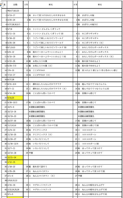 たとえばヨッシーが図工専科として新年度に予定している指導計画は次のようだ(教科書は日本文教出版)。