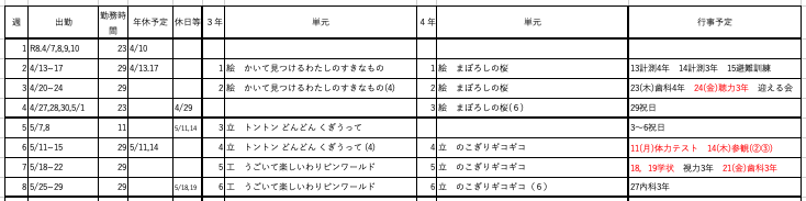 年間を通して予定変更が多くなるのは運動会前の1ヶ月だ。ヨッシーの予定では、運動会前は授業予定を組まず、空けてある。もちろん担任と相談しながら授業を入れたり休みにしたりしていく予定だが、3週間程度、図工の授業を入れなくても3月上旬までに60時間の授業が終えられるように計画を組むことは可能だ。
